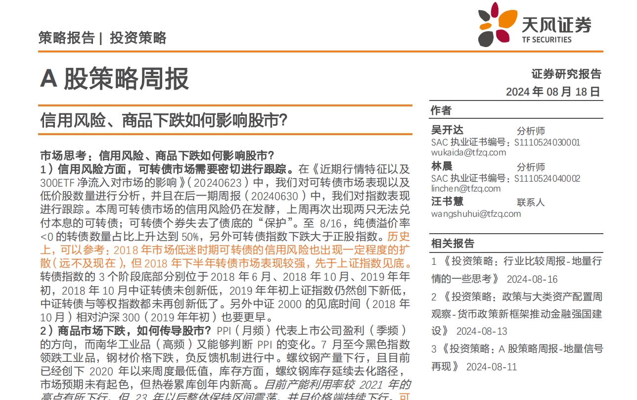 市场思考:信用风险、商品下跌如何影响股市?1)信用风险方面,可转债市场需要密切进行跟踪。在《近期行情特征以及300ETF 净流入对市场的影响》(20240623)中,