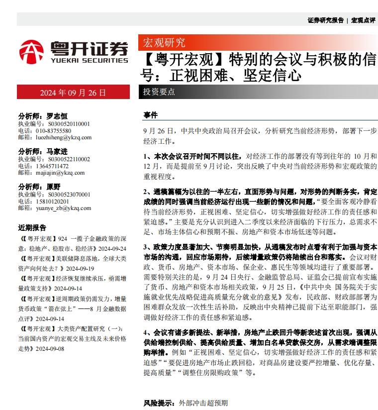 核心观点: 此次突破惯例,于 9 月 26 日召开政治局会议,讨论经济与资本市场相关问题,表