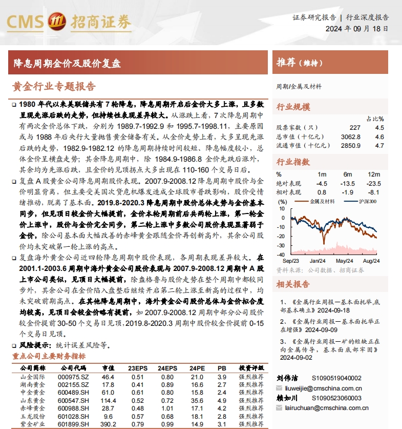 招商证券-黄金行业专题报告:降息周期金价及股价复盘