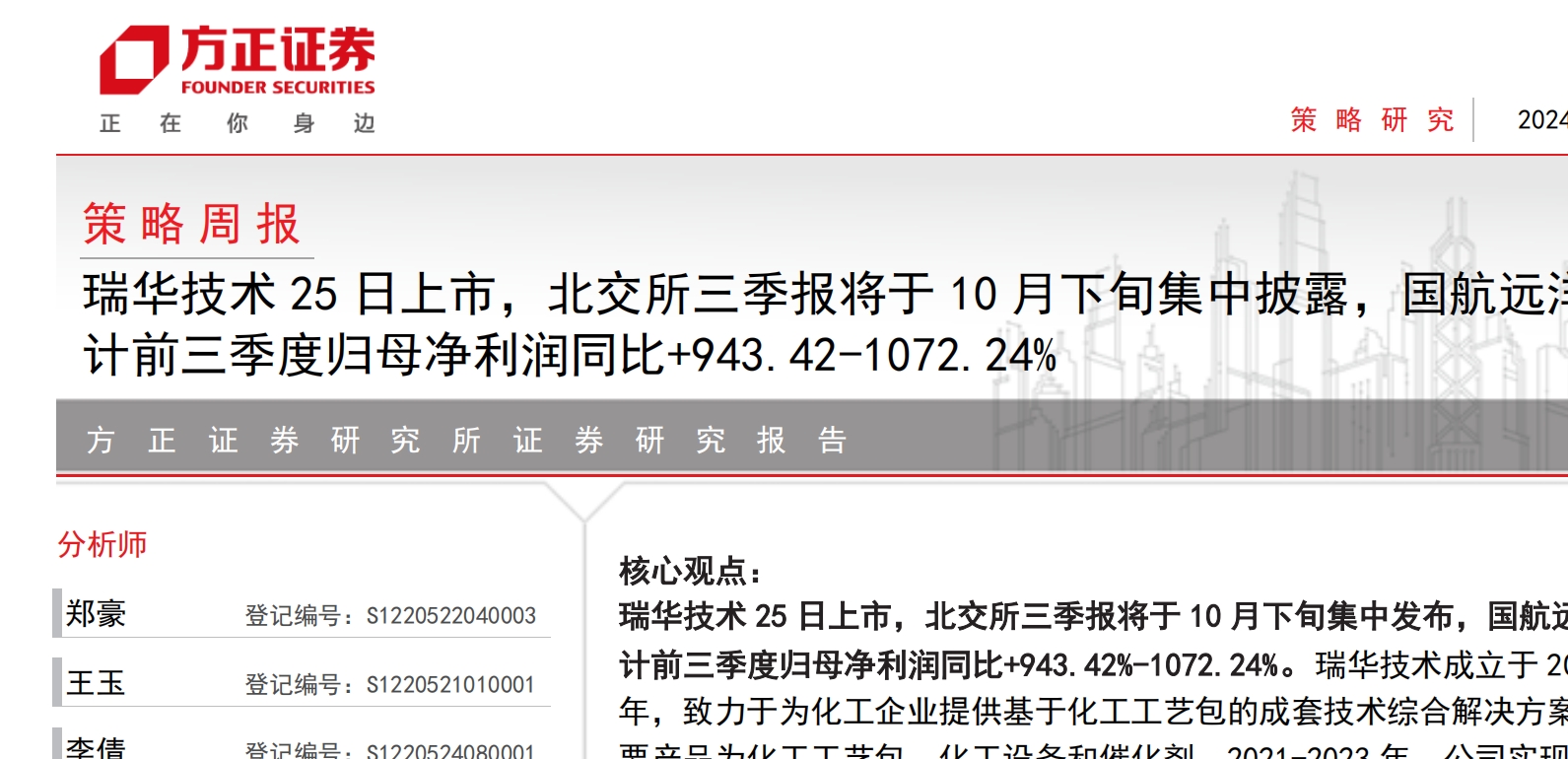 方正证券-策略周报:瑞华技术25日上市,北交所三季报将于10月下旬集中披露,