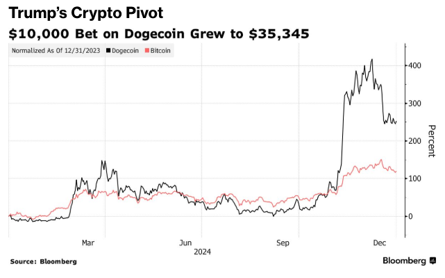 投机者纷纷涌向加密货币,期待特朗普承诺将美国打造成该领域的全球关键。备受迷因圈喜爱的狗狗币上涨了253%,将1万美元的押注变成了35,345美元。如果选择市场领先者比特币,押注结果也将达到22,046美元。在此过程中,比特币达到了108,316美元的历史新高,随后回落。