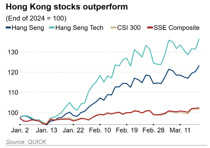香港股市正一路高歌猛进。截至周二,基准恒生指数今年以来已飙升23%,恒生科技指数(衡量在香港交易的顶级科技股的指标)更是上涨了惊人的36%。