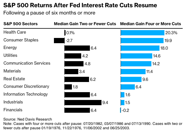 看涨交易者可能站在历史的一边:Ned Davis Research公司自上世纪70年代以来的数据显示,在暂停六个月或更长时间后,一旦降息周期恢复,标普500指数在一年内平均上涨15%。相比之下,在一个普通周期的首次降息后,同期涨幅为12%。