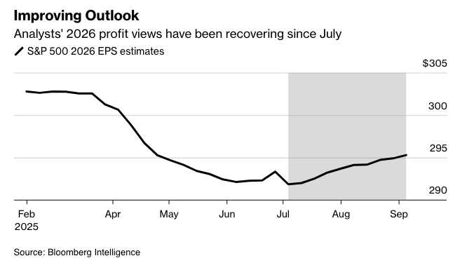 对未来波动率的衡量指标显示市场处于休眠状态,分析师对2026年上半年的盈利预期正在回升,接近年初时的水平。自从7月份触底以来,标普500指数的2026年盈利预测在过去九周内每周都在上涨。根据彭博行业研究的数据,每股盈利295美元,与4月下旬的水平一致。