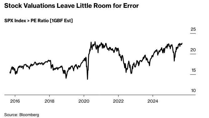 “在美国联邦储备委员会可能降息之前,美国股市的估值已经达到了与互联网泡沫破裂前夕相当的水平。如果标普500指数目前22.6倍的远期收益率能够维持到周三——届时预计美联储将降息25个基点——这将是彭博社自1990年以来的数据显示,降息时最高的市盈率倍数。”