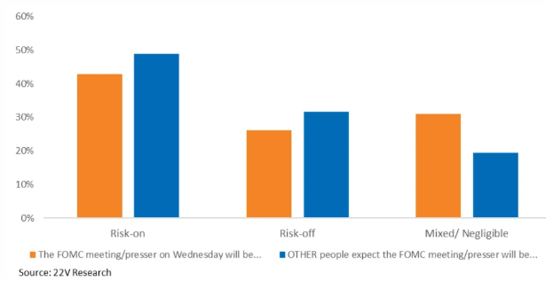 22V Research进行的一项调查显示,受访者倾向于“风险偏好”(43%),以应对美联储会议,31%表示“混合/可忽略不计”,26%表示“风险规避”。