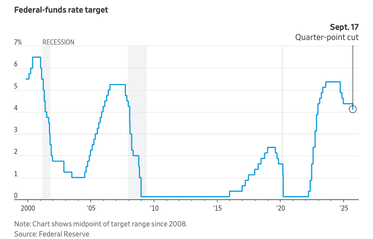 此次降息将把联邦基金利率目标区间降至4%到4.25%之间,这是近三年来最低水平。降息应能为信用卡余额较高的消费者和持有浮动利率债务的小型企业提供一些即时缓解。抵押贷款利率和其他长期借贷成本对美联储的单独行动不太敏感,但由于投资者预计会有一系列适度的降息,近几周来有所下降。