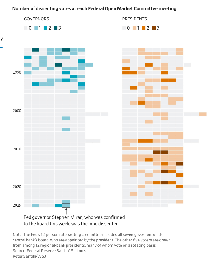 在12名美联储投票者中,有11人支持降息25个基点。美联储理事斯蒂芬·米兰,在本周确认进入央行董事会之前,曾担任白宫高级顾问,他是唯一的反对者。他倾向于降息50个基点。