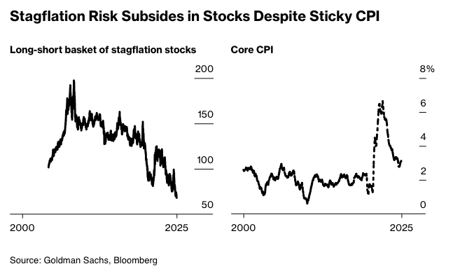 投资者似乎在呼应美联储从通胀焦虑中转移的立场。本周的通胀保值债券拍卖的需求降至2022年以来的最低水平。高盛设计的一个旨在从滞胀中获益的股票组合——做多长期通胀赢家,做空输家——刚刚跌至历史新低。