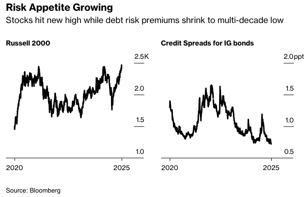 一次旨在缓冲疲软劳动力市场的降息,过去可能会引发谨慎。 然而,它却点燃了风险资产的热情,垃圾债券和无盈利科技公司的股票纷纷上涨。 全球股市创下历史新高,信贷息差收紧至1998年以来的水平。