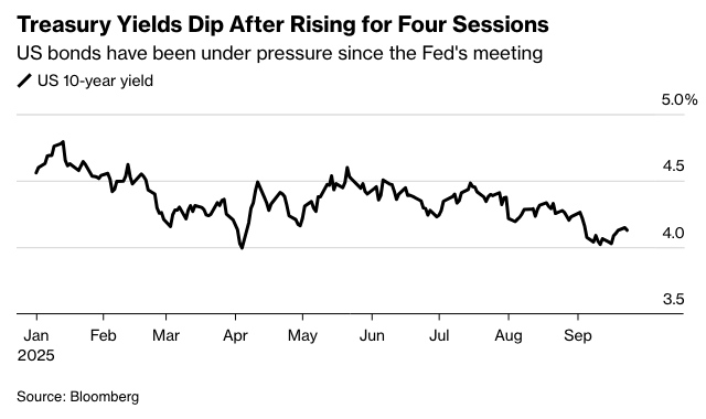此次上涨推动各期限国债收益率下降了2到4个基点,其中10年期国债收益率降至4.11%。 自鲍威尔上周暗示决策者将对进一步降息采取谨慎态度以来,市场一直承受压力。