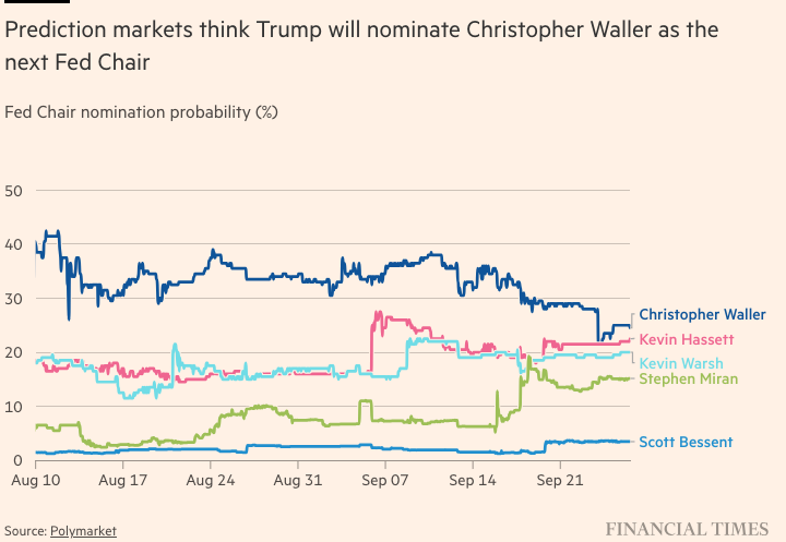 在《金融时报》芝加哥布斯商学院的民意调查中,受访者从被认为是美联储主席的热门人选名单中选择了五位候选人——沃勒、哈塞特、贝森特、沃什和米兰。