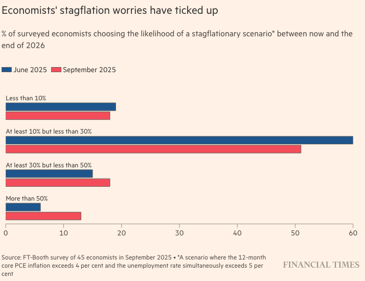 然而,接受调查的学术经济学家认为,滞胀(失业率和通货膨胀同时上升)的可能性正在增加。