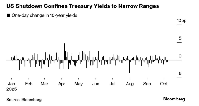 自上周政府关门开始以来,美国国债的预期波动性已经大幅下降,推迟了对就业和通胀等至关重要的官方报告的发布,而这正值关键时刻——在美联储今年剩余的两次会议之前。下一次会议将在几周后举行,预计在10月29日做出决定。