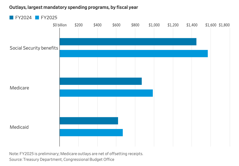2025年,社会保障支出增长了8%,部分原因是国会决定扩大对某些公共部门雇员的福利,追溯至2024年1月。医疗保险和医疗补助也分别增长了8%。美国国会预算办公室(CBO)表示,医疗保险的参保人数正在上升。由于共和党税收和支出立法中的资格限制,医疗补助的成本未来可能不会增长得那么快。