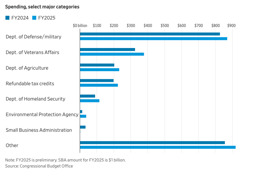 除了学生贷款,国会预算办公室(CBO)表示,实际支出下降的主要类别只有联邦存款保险公司(FDIC),因为它在解决银行倒闭问题上的支出减少,以及小企业管理局(SBA),因为 2024 年与灾难相关的贷款成本在 2025 年没有再次发生。