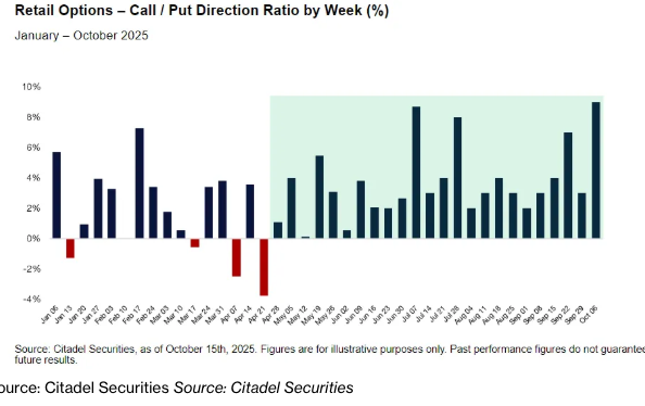 Citadel Securities 的 Scott Rubner 援引追溯至 2020 年的数据称,散户交易者对看涨期权的需求已经连续 24 周超过看跌期权,追平了 2023 年 11 月创下的最长纪录。