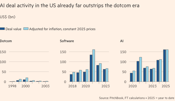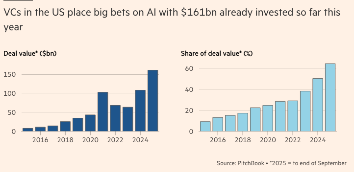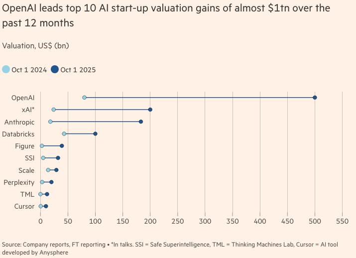 大部分投资流向了 10 个人工智能团队——Perplexity、Anysphere、Scale AI、Safe Superintelligence、Thinking Machines Lab、Figure AI、Databricks,以及 OpenAI、Anthropic 和 xAI。据《金融时报》计算,这使得它们的总估值增加了近 1 万亿美元。