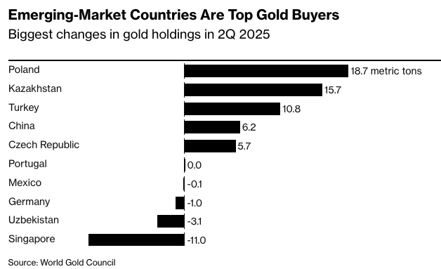其他投资者表示,他们正在关注波兰、土耳其和哈萨克斯坦等国,这些国家都在增加黄金储备。安石集团(Ashmore Group Plc)的固定收益投资组合经理亚历克西斯·德·莫内斯表示,虽然这一趋势总体上是积极的,但投资者不应过度解读。