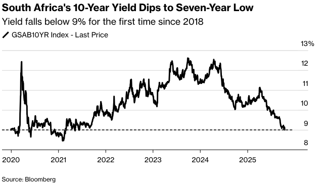 南非富时/约翰内斯堡证券交易所非洲综合指数在2025年上涨了超过30%。兰特汇率接近一年来的高点,10年期政府债券收益率最近跌破9%,为七年多来的首次。通货膨胀放缓,使该国央行得以降低利率,这也提振了市场情绪。