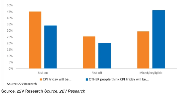22V Research 进行的一项调查显示,45% 的投资者认为市场对 CPI 的反应将是“风险偏好”,26% 认为“风险厌恶”,29% 认为“混合/可忽略不计”。