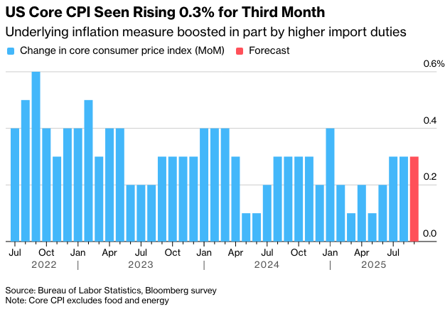 彭博社调查的经济学家预测,核心CPI(不包括食品和燃料,以便更好地反映潜在通胀)将连续第三个月上涨0.3%,因为更高的进口关税继续逐渐传递给消费者。 预计的月度涨幅将使年度核心CPI保持在3.1%。