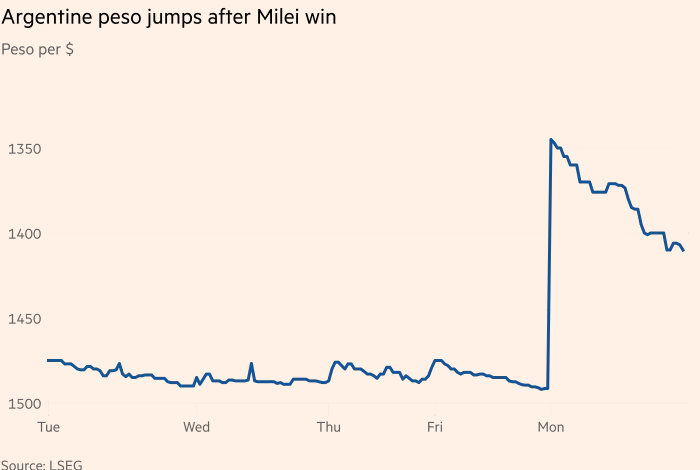 近几周,由于担心米莱的改革计划前景,国际投资者和当地储户将资金撤出该国,布宜诺斯艾利斯已经耗尽了稀缺的外汇储备,以努力支撑比索。