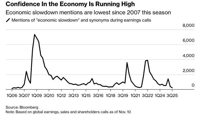彭博追踪的在销售、指引和盈利电话会议中提及“经济放缓”及其同义词的次数为2007年以来最低。尽管政府停摆扰乱了美国官方数据。而与此同时,标普500指数正朝着连续第三年高回报的方向发展,股票价格已达到疫情后峰值时的水平。
