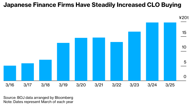 在日本,包括农林中央金库和日本邮政银行在内的公司也在投资CLO,其总持有量达到约20万亿日元(约合1300亿美元)。