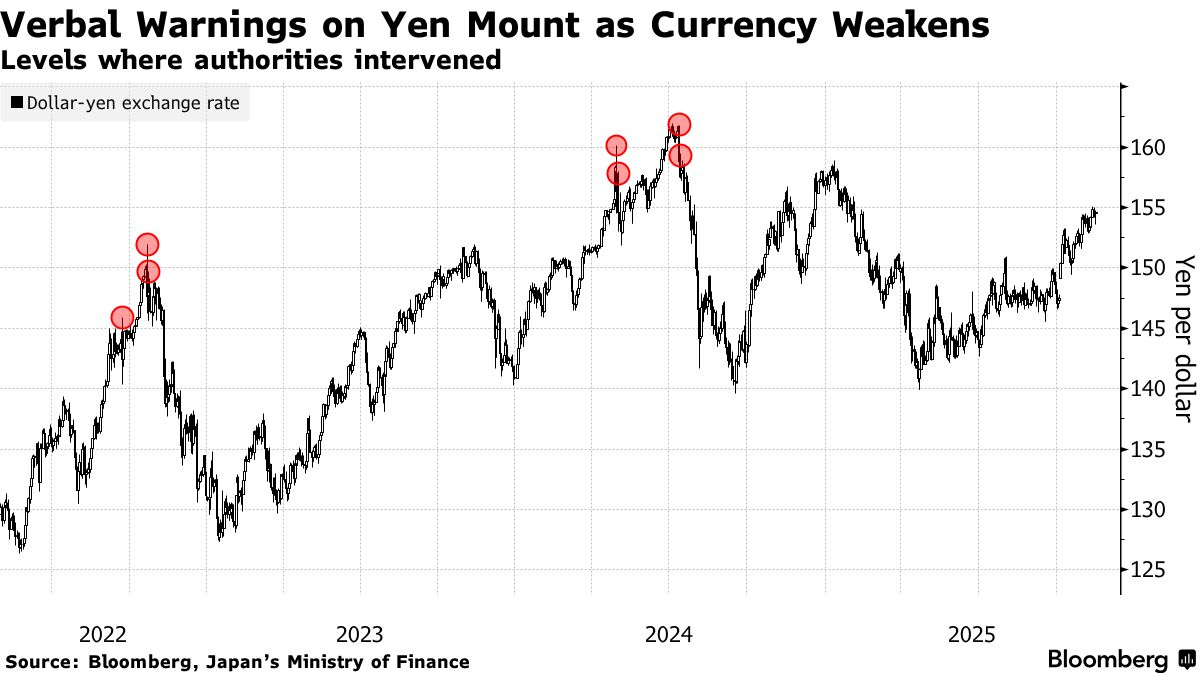 在高市早苗上任后,刺激政策的可能性以及降息预期减弱,给日元带来了新的压力。上周日元跌至九个月来的最低点,导致官方警告称汇率波动已变得单边化。日元进一步走弱可能会加剧人们对政府可能干预市场的担忧,因为目前汇率已接近此前曾促使当局入市干预的水平。