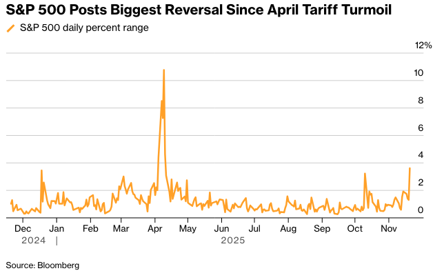 标准普尔500指数下跌1.6%。在周三晚间英伟达的业绩发布后,该指数在上午的交易中一度上涨1.4%,似乎至少暂时缓解了对人工智能股票泡沫风险的担忧。根据彭博社汇编的数据,该美国股票基准指数录得自4月份关税动荡高峰以来最大的盘中反转——达到3.6%。该指数目前已从最近的高点下跌5%。