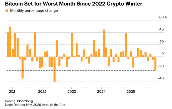 这些数字很难忽视。比特币11月份下跌超过20%,是自2022年加密货币崩盘以来最糟糕的一个月。英伟达正面临自3月份以来最剧烈的月度跌幅。高盛的散户青睐股票指数已从10月份的高点下跌17%。波动性飙升。对崩盘保护的需求已经回归。