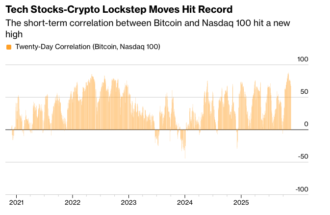 根据彭博社汇编的数据,比特币与纳斯达克100指数之间的短期相关性在本月初创下历史新高。 甚至标准普尔500指数也显示出与数字资产之间不寻常的同步性。