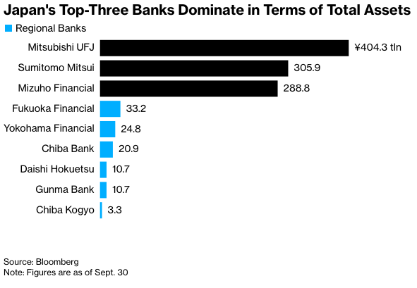 区域银行总资产超过500万亿日元(3万亿美元),其中不乏大型企业,例如横滨金融集团和福冈金融集团,彭博汇编的数据显示,这两家公司的总资产均超过20万亿日元。