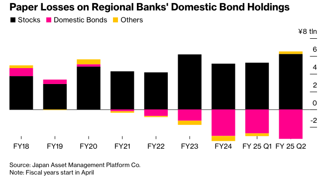 对于地方银行来说,一个主要的难题是日元债券上的未实现亏损。据Japan Asset Management Platform Co.的数据显示,截至9月底,地方银行持有的日元债券上的账面亏损总额约为3.3万亿日元,是日本央行于2024年3月底结束刺激政策时的2.6倍。