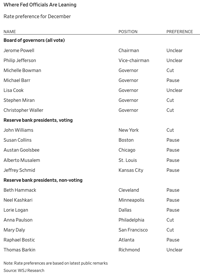 越来越多的官员对进一步降息表示反对或担忧。他们认为,通货膨胀居高不下是由于受到关税影响的商品(他们担心这种情况可能会加剧)以及国内服务业的影响,这表明价格压力可能正在扩大。他们担心过快降息,如果明年经济加速,美联储将陷入困境。