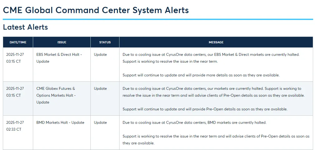 芝加哥商业交易所 (CME) 于2025年11月28日发出警报来源:彭博社