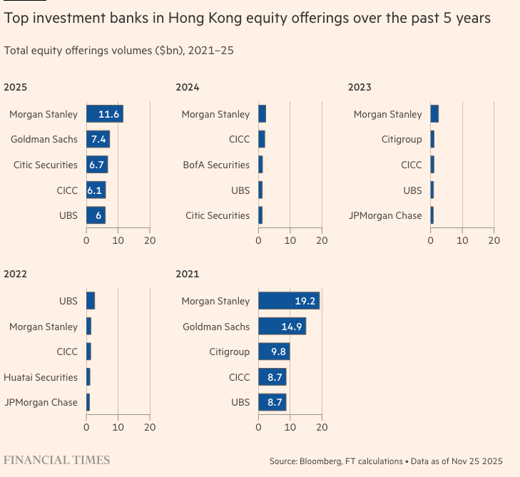 据彭博汇编的数据显示,截至11月底,摩根士丹利在股票发行中筹集了116亿美元。高盛以筹集74亿美元位居第二,其次是中国的中信和中金,以及瑞士的瑞银。