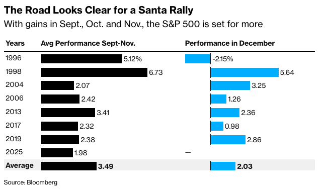 Nationwide的Mark Hackett表示:“季节性因素、消费者支出稳定(尽管情绪不佳)以及年终仓位调整都为今年的圣诞行情奠定了基础,而且最有可能在下半月出现。”