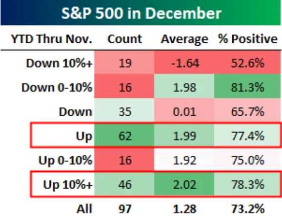 据Bespoke Investment Group的数据显示,回顾自1928年以来的标普500指数,在进入12月前指数涨幅超过10%的年份(如今年),历史上12月的表现往往最为强劲,平均涨幅超过2%。