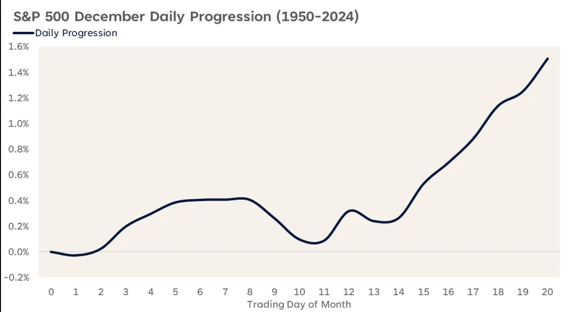 虽然十一月下旬的势头可能会延续下去,但LPL Financial的Adam Turnquist指出,十二月的强势通常出现在下半月。