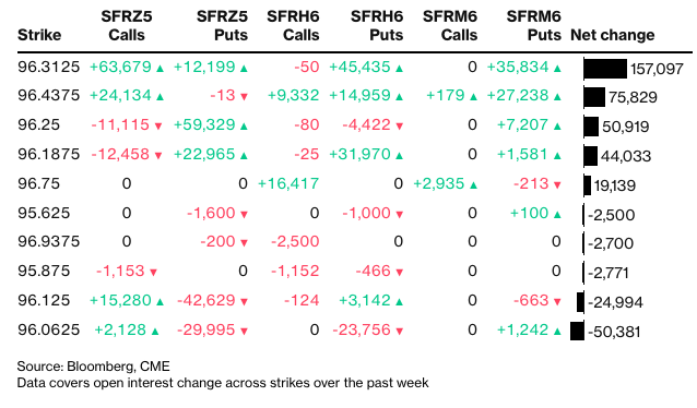 在SOFR期权中,直至2026年6月到期的合约,96.25的行权价仍然是最活跃的,因为对涉及2025年12月期权水平的上行看涨期权结构的需求持续存在。此外,2025年12月到期的96.50和96.375看涨期权也存在大量的未平仓合约。对于大量未平仓的看跌期权结构,2025年12月到期的96.25和96.1875看跌期权的行权价非常活跃。
