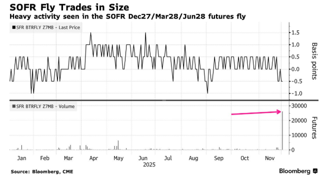 驱动期货利差交易活跃的不仅仅是下一任美联储主席的公告。高盛策略师正在寻求在12月16日公布的11月劳动力市场数据(正好在1月政策会议之前)之前进行对冲。由于美国政府停摆而延迟公布的数据,如果证实最近出现疲软的迹象,可能会刺激更多鸽派押注。