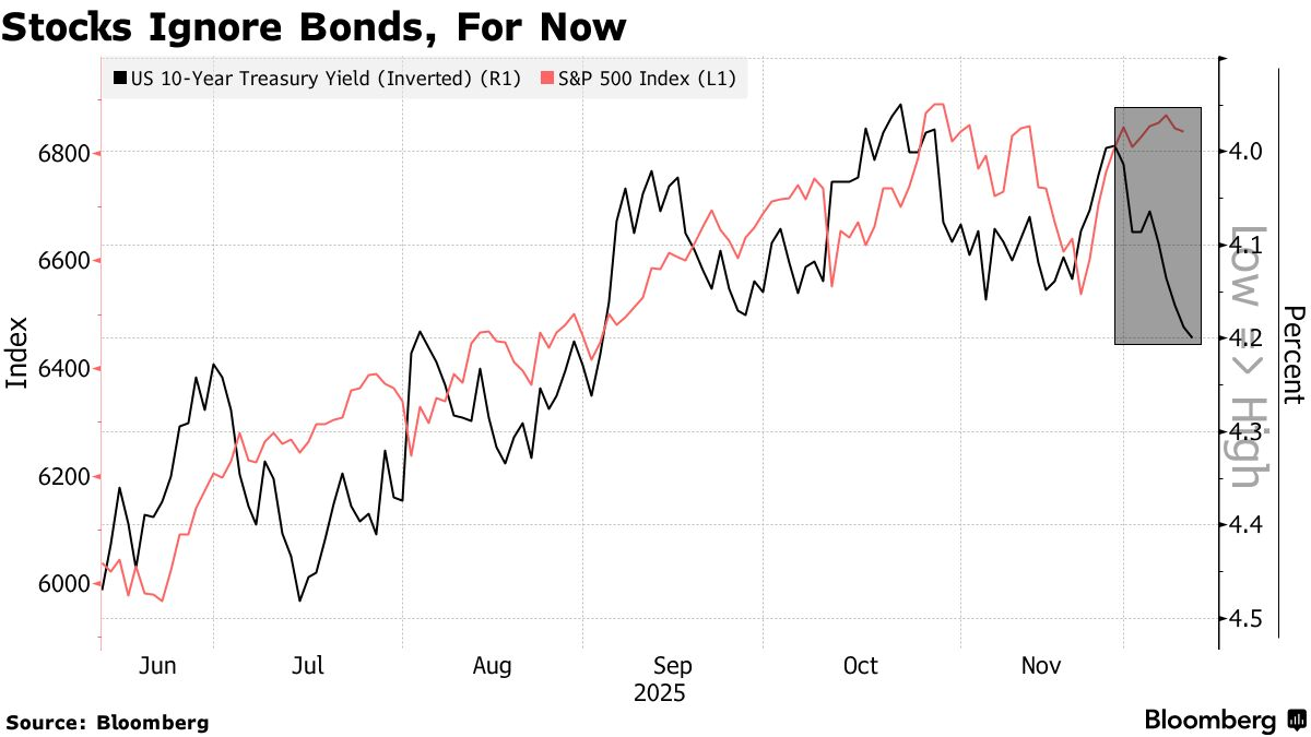 “美联储新的经济预测显示,今年和2026年的通胀预期均有所下调,而失业率预测与9月份相比保持不变。 即使这并没有转化为明年更为鸽派的利率前景,它也巩固了支撑今年以来股市上涨的‘金发姑娘’叙事。”