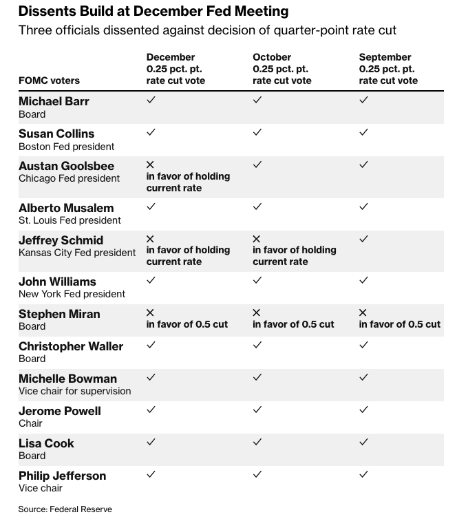 该结果标志着自2019年以来首次出现三位官员投票反对一项政策决定的情况,且对该政策的不同意见分别来自政策光谱的两端。标普500指数上涨,而美国国债收益率和美元则下跌。市场对2026年降息的预期未见重大变化。