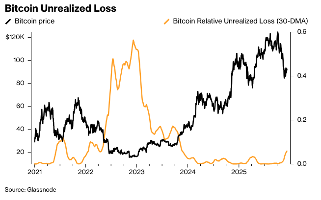 加密货币分析公司Glassnode表示,多项指标表明市场处于“温和的看跌阶段”,其特征是适度的资金流入被大型持有者的稳定抛售压力所抵消。该公司指出,由于价格停滞在“疲软但有界限的区间内”,时间本身成为一种负面力量,因为未实现的损失正在积累。相对未实现的损失跃升至4.4%,这是近两年来的最高水平(此前大部分时间都低于2%),这表明市场正从狂热转向“高度压力和不确定性”。