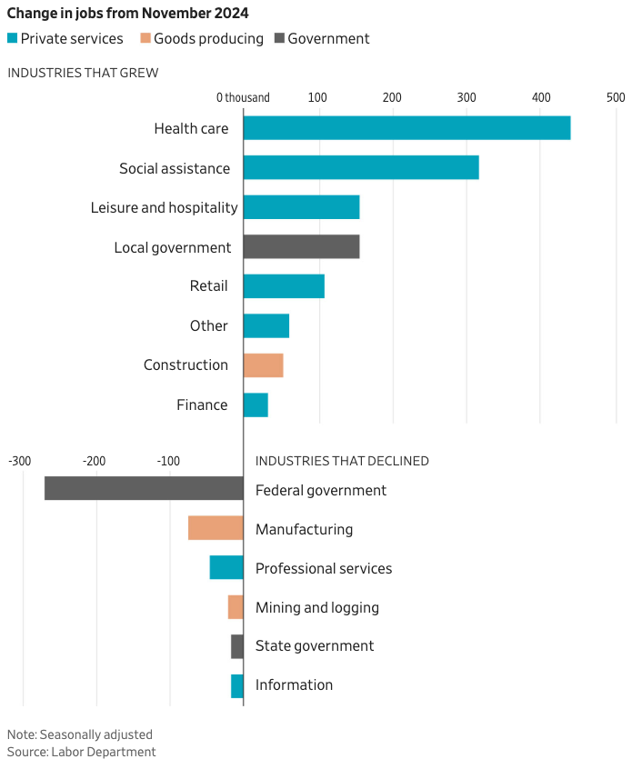 11月份,联邦政府雇员减少了6000人,这使得10月份联邦政府大量裁员16.2万人雪上加霜。劳工部表示,自1月份以来,联邦政府雇员减少了约27万人,降至十多年来的最低水平。