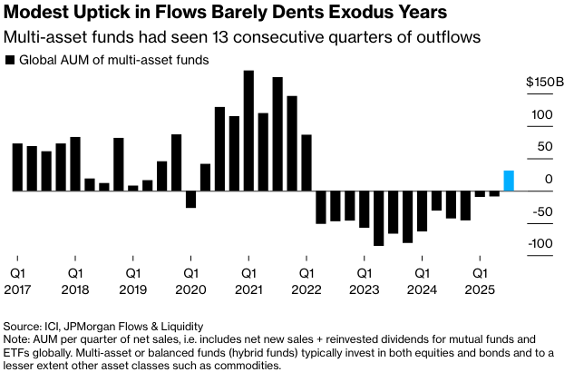 近年来,尤其是散户投资者,一直在撤离平衡型和多元资产基金。摩根大通的数据显示,包括公共风险平价基金和传统上将60%资产配置于股票、40%资产配置于债券的60/40投资组合在内的这一类别,已经连续13个季度出现资金流出,尽管今年秋季出现小幅反弹。虽然资金持续流入专门的债券和股票基金,但中间地带——传统的混合策略——仍然不受欢迎。
