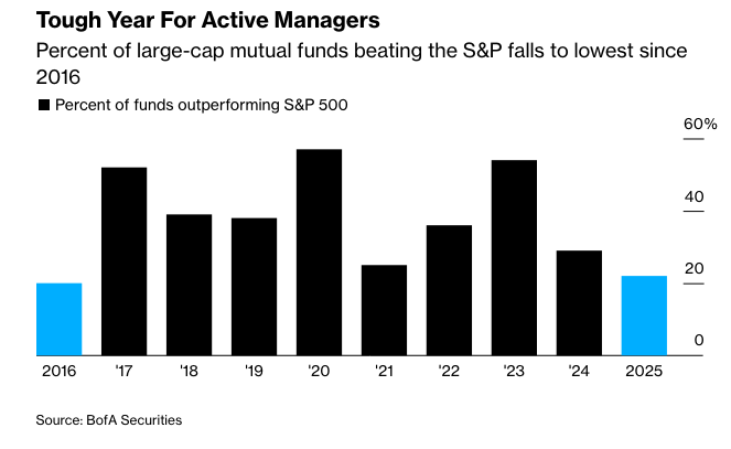 根据美国银行全球研究的数据,今年只有22%的主动管理型大盘基金跑赢了标普500指数,这是自2016年以来的最低比例,远低于40%的平均水平。