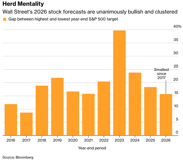 这种步调一致的观点通常被认为是反向指标——当所有人都倾向于同一个方向时,这种失衡往往会自行纠正。而且,他们发表观点的时间点正值市场风险显而易见之际。尽管如此,策略师们平均认为,即使在连续三年获得两位数回报后,2026年股市仍将获得更多收益。